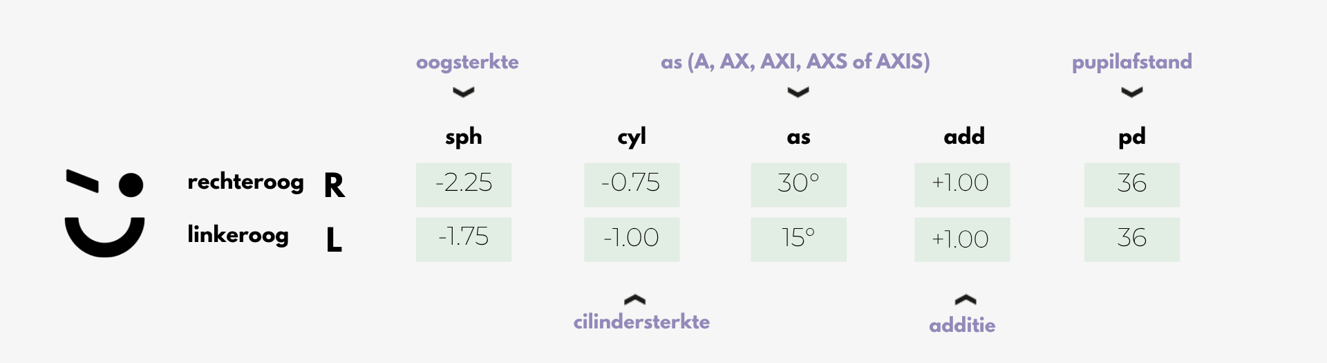Kun je nu je brilrecept lezen? Dan ben je klaar om je nieuwe bril te bestellen. Tijdens het bestelproces kun je de waarden eenvoudig invullen, zodat wij de glazen precies op maat kunnen maken. Zo zorgen we samen voor een bril die perfect bij jouw ogen past.
